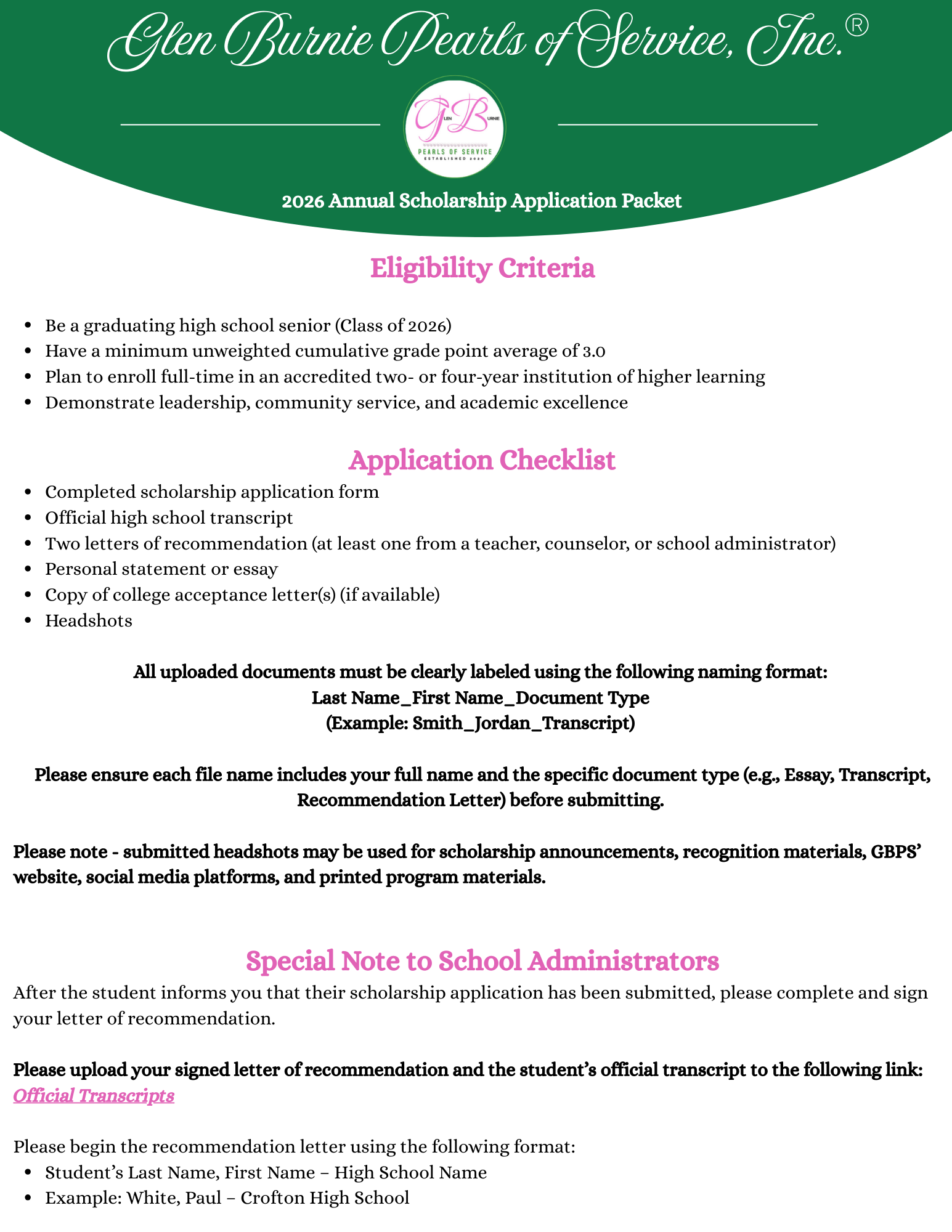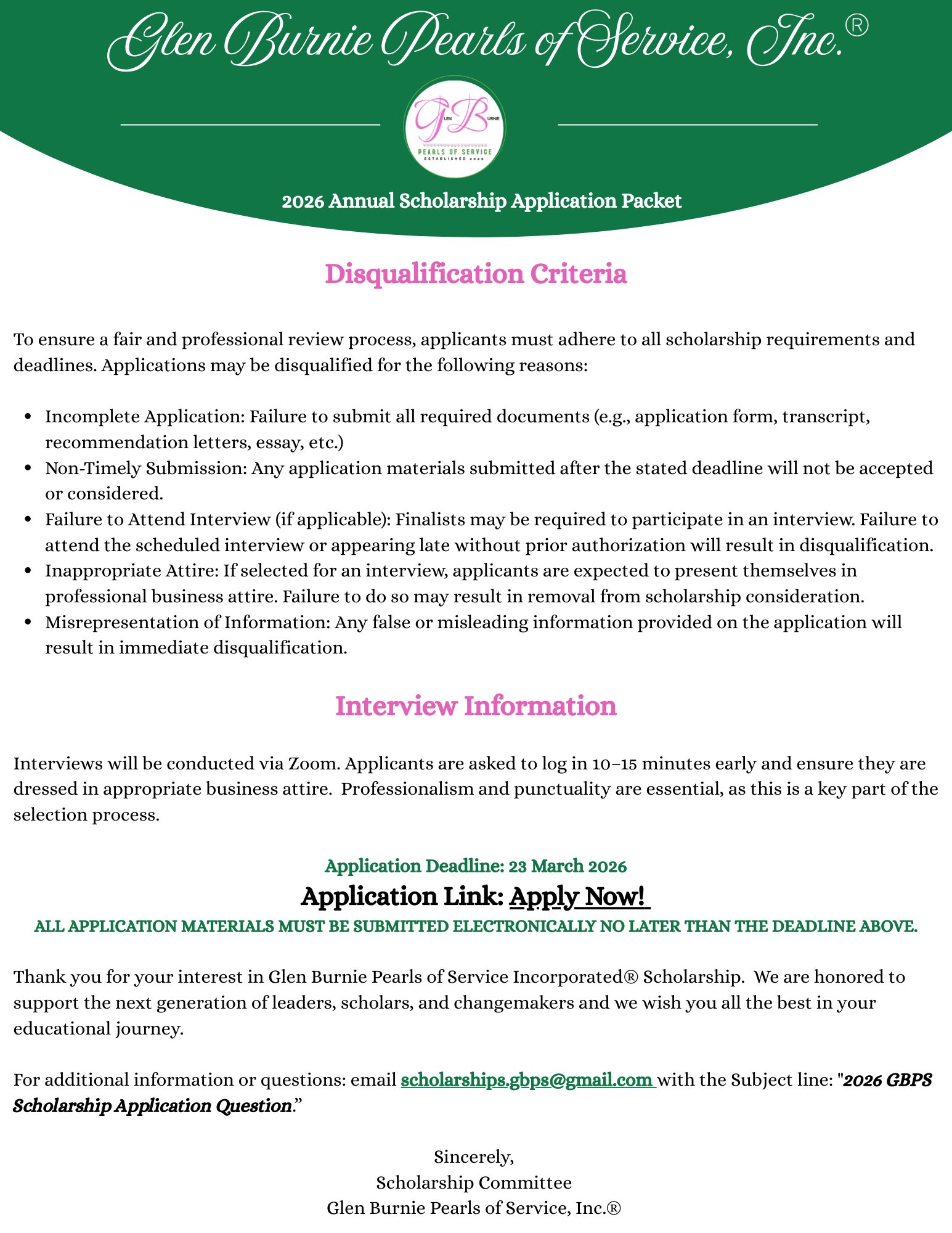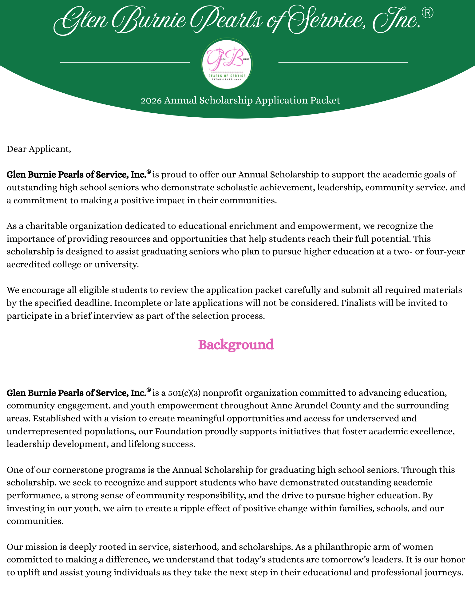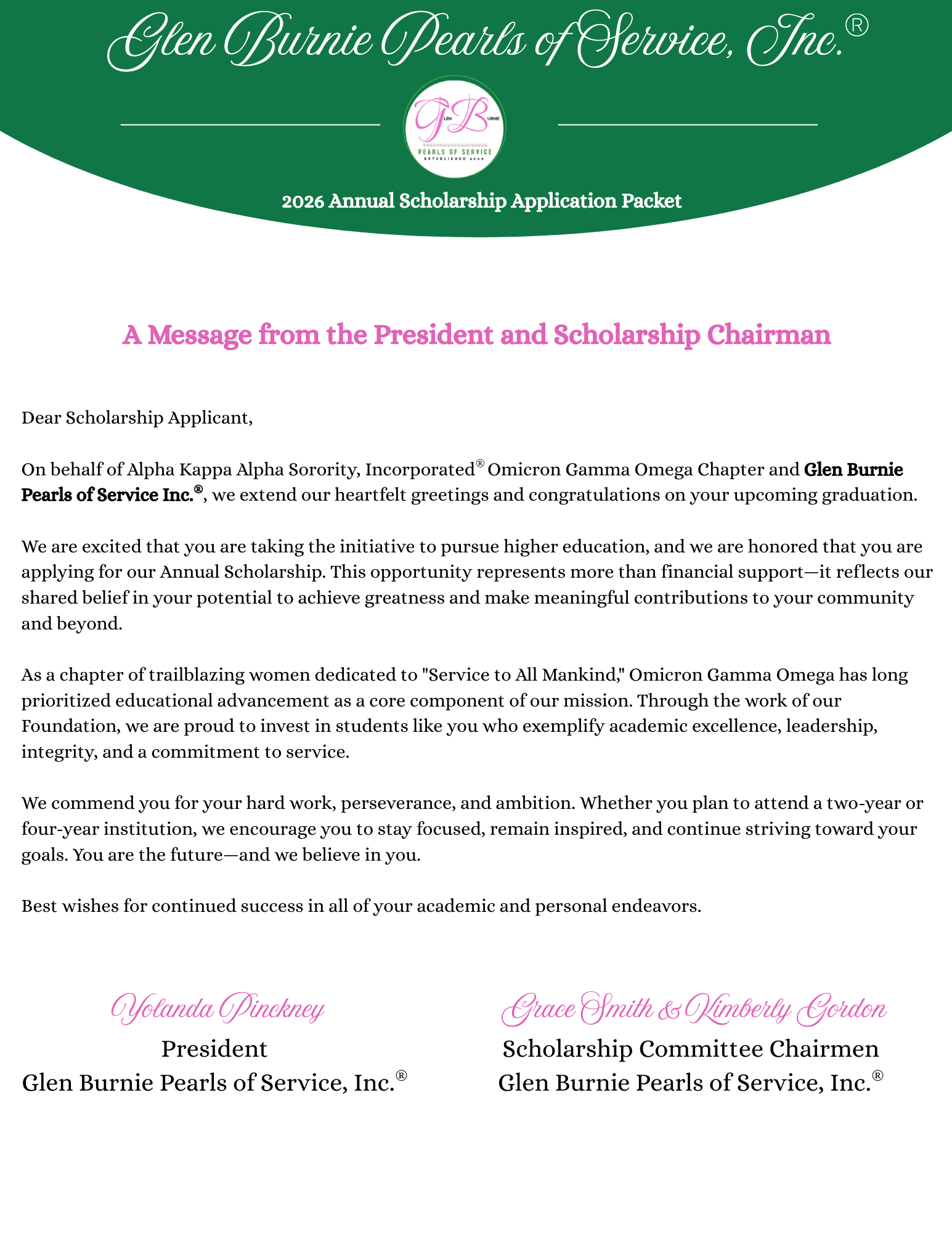 Glen Burnie Pearls of Service, Inc.®, in partnership with Alpha Kappa Alpha Sorority, Incorporated® Omicron Gamma Omega Chapter, proudly awards annual college scholarships to graduating high school seniors pursuing higher education.
